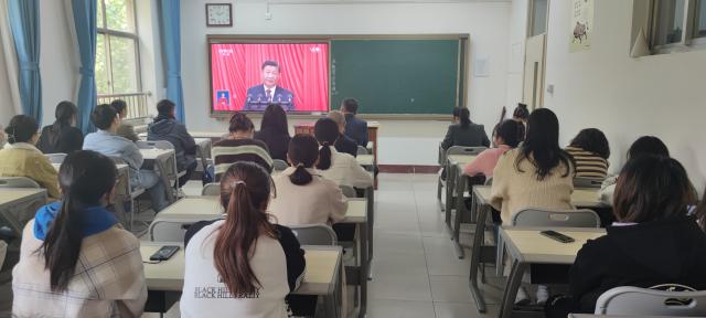 组织师生集中收看大会盛况。学院党委书记明辉、教师党员代表与所有学生党员、入党积极、学生会成员集中观看。