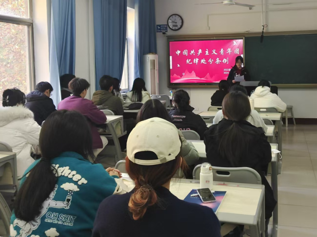 各班级团干部分别组织开展主题团日等活动,带领全体团员深入学习《中国共产主义青年团纪律处分条例(试行)》,具体分析了对团内违法犯忌团员的处分分类、责任区分及处分后果等内容。各班团干部宣读《中国共产主义青年团纪律处分条例(试行)》,并详细阐述该条例制定的背景及意义。