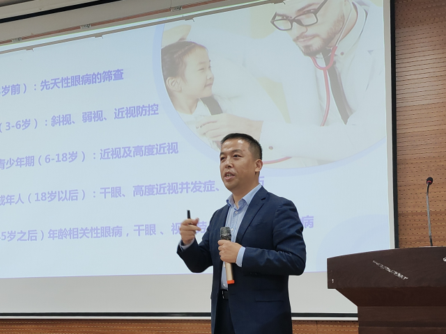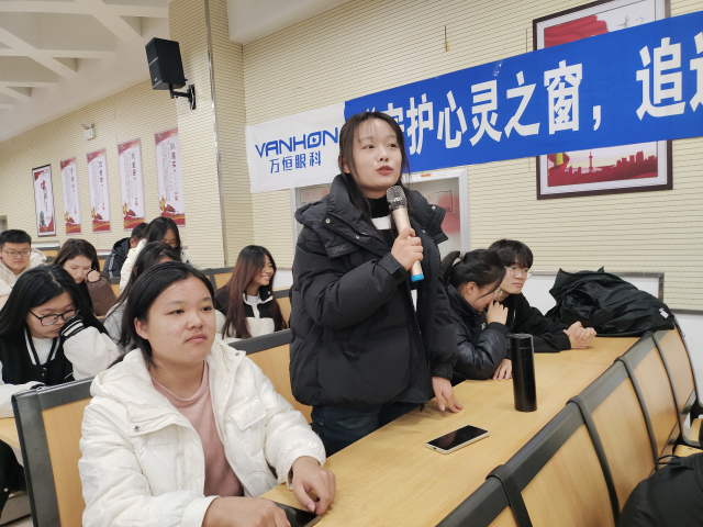 魏自广分别从形成近视的基本原理、近视的诱因及后果、近视的治疗技术三个方面展开演讲,首先谈到学生关心的日常用眼问题,对于在学习生活中因不正当用眼导致视力下降或出现其他眼睛问题的情况做出了列举,倡导学生在日常学习生活中保护眼睛,并教授如何养成良好用眼习惯的方法。随后对不同年龄段造成近视的原因进行简要概括,并描述在不同年龄段造成近视时眼部构造变化及相应后果。最后对当下近视屈光手术全飞秒激光、半飞秒激光以及人工晶状体植入术等治疗方法进行了详细介绍。在互动环节中,同学们积极参与,魏自广对同学们所提出的问题进行详细解答,并为参与互动的同学分发小礼品作为鼓励。随后医院的工作人员设立眼压测量仪、电脑验光仪等专业设备,现场为同学进行免费检查,并由眼科专家根据检查结果为同学提供针对性建议。