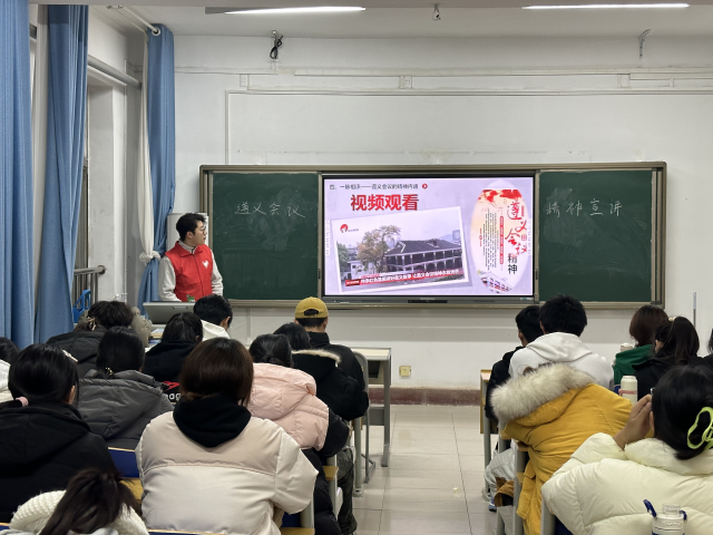 于一号办公楼307教室举办了遵义会议精神宣讲活动,由来自马克思主义学院的研究生钟翠主讲,本次活动吸引了众多心怀爱国之情的同学踊跃参与。