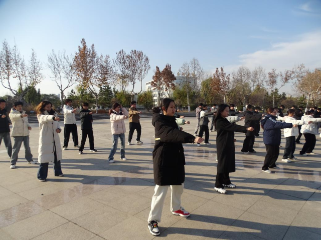 冬日暖阳下,同学们舒展身姿,尽显八段锦“形气神合一”的韵律与美感。与此同时,在教室和宿舍等室内场景中,亦可见到同学们将传统养生实践融入到日常学习生活当中的生动画面,有的同学在逐步学习八段锦的动作细节,有的同学在讨论腰胯发力要领,同学们互相纠正动作,交流动作要领的场景都是同学们将传统养生文化融入到日常生活的积极尝试,看似零散的自主练习却是构建第二养生空间的主动追求。练习过程中,“起吸落呼,开吸合呼”的要领贯穿始终,百余人的呼吸节奏趋于一致,这份同步不仅体现于肢体动作的协调一致,更内化于心神状态的高度专注。待最后一式收势,同学们掌心轻落腹前,在舒缓的音乐当中完成收势动作;舒展筋骨的同时,心绪亦渐趋平和,在肢体的舒展中释放了学业压力,于沉静的节奏里回归了身心平衡,将健康理念融入在实践体验中。
