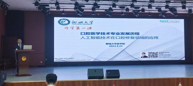 表示欢迎和感谢。随后,石永吉以“我们将来有什么样的机会,有什么样的机遇”为话题引入,通过讲述口腔医学技术专业的发展简史、代表人物以及他们在技术发展方面的成就,结合自身经历和迈尔集团的发展,向大家介绍了口腔义齿行业的发展变革及人工智能在口腔修复领域的一些应用等内容,希望同学们秉承匠人匠心精神努力学习,将来在行业的建设发展中有所建树。校友代表刘风平鼓励大家多去了解口腔医学技术领域的发展,全面提升自己的综合素质,合理规划自己的职业生涯,找准定位,努力实现人生价值。