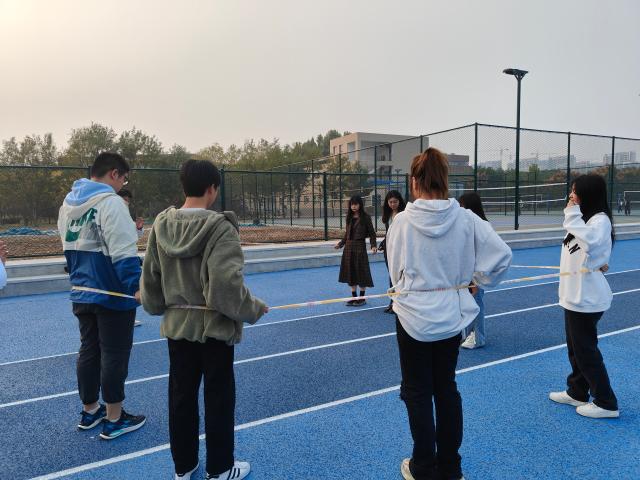 主持人把事先准备好的大绳圈分别交给两组同学,同学们根据主持人发出的变形指令,互相配合,默契协作,用时最少的组为胜。在变形的过程中,各小组成员不允许用语言交流,仅可通过眼神交流和肢体动作完成任务。“变形虫”项目,同学们感悟到人际交往中理解、合作、认同的重要性,有利于提高人际交往的能力。