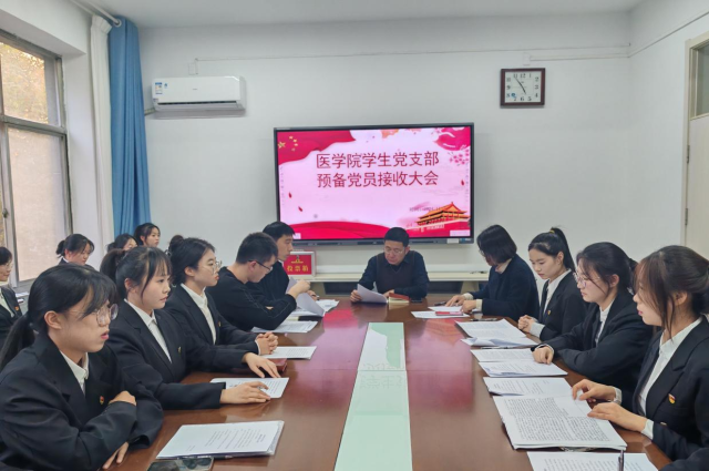 学生党支部于弘道楼三楼会议室举办预备党员接收大会,党委副书记、副院长王炜明、辅导员李孝杰、冯昌顺以及全体学生党员参会,团委书记白东芳主持。