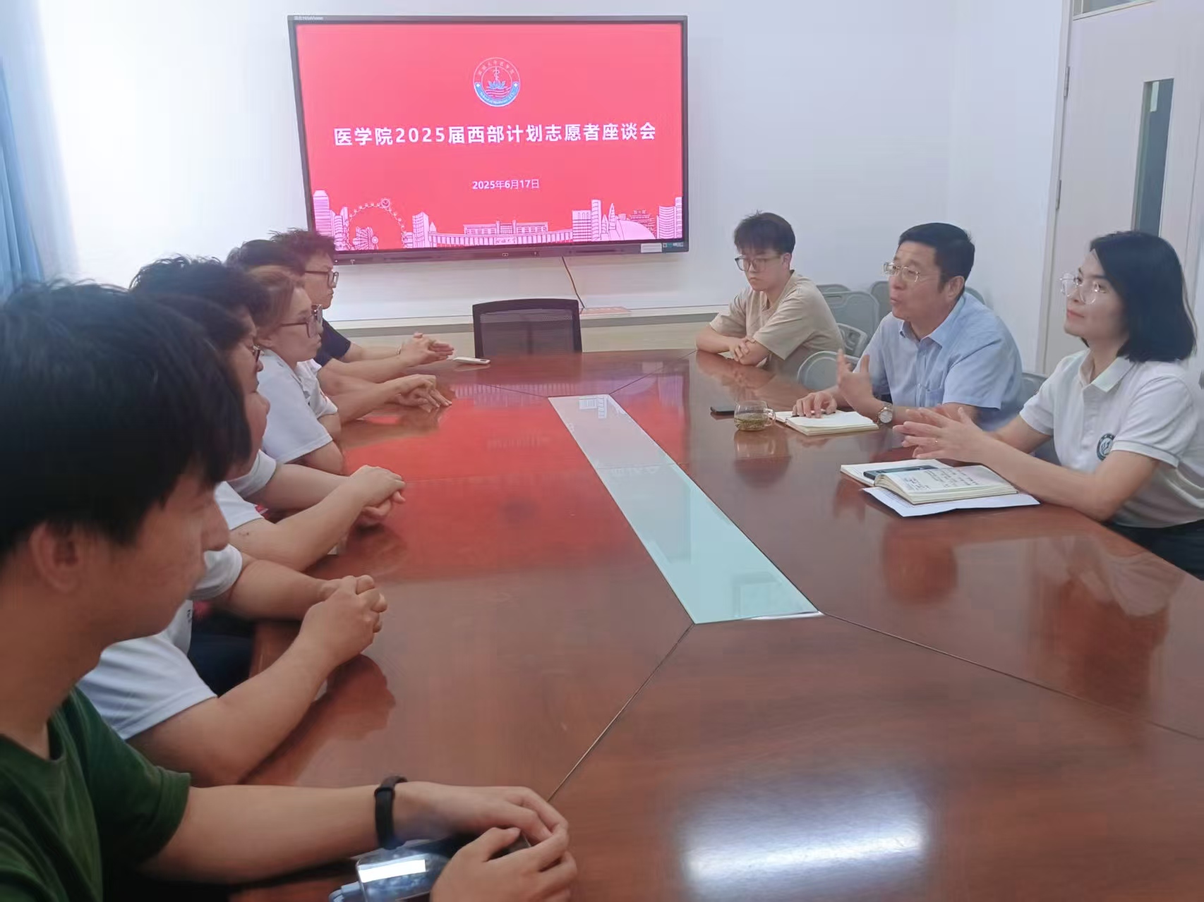 于弘道楼三楼会议室举办西部计划志愿者座谈会。学院党委副书记、副院长王炜明、辅导员代表、4名2025届西部计划志愿者及2022级在校生代表参会。