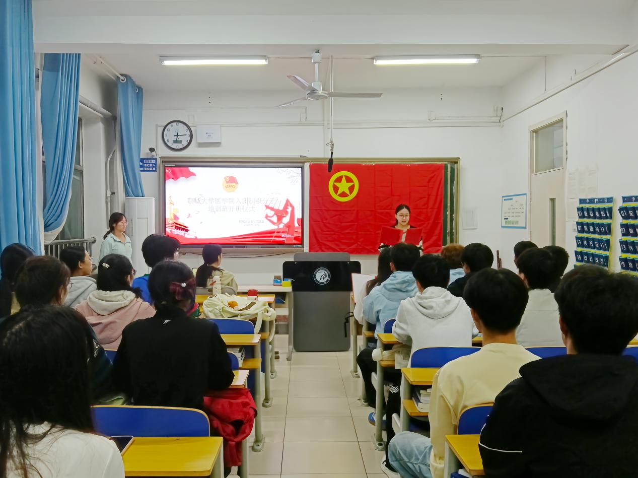 专业特色,并从五个方面对积极分子提出期望:一是立鸿鹄志、铸坚定信念,将个人理想融入国家医疗事业;二是修高尚德、炼优良品格,以医疗职业操守为准则传递正能量;三是强学识基、提综合素养,兼顾专业学习与见习、义诊等实践活动;四是行实干风、勇担作为,以优秀团员为榜样,从小事践行进步决心;五是持进取心、求持续进步,以入团为新起点,定期向团组织汇报思想动态。随后,张祈月以“共青团的光辉历程”为主题开展团课,系统讲解共青团的起源发展、团徽象征意义、基本任务与属性,结合五四运动、“一二·九” 运动等历史事件,梳理共青团在革命、建设、改革不同时期的使命与担当,帮助积极分子深化对团组织的认知与认同。仪式最后,全体人员共同观看《团员第一课》专题视频,通过鲜活案例与生动讲述,直观理解团员的责任义务与共青团的时代使命。