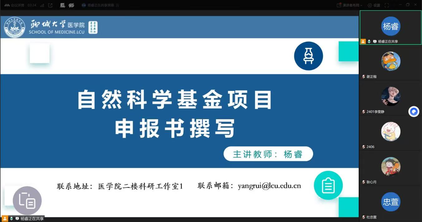 此次会议紧扣素养提升核心,聚焦科研素养培育需求,重点讲解国家自然科学基金、省级项目及大学生创新创业项目资助体系,并对面上项目、青年科学基金项目、重点项目等各类项目的资助特点与要求展开详细解读。杨睿首先解读山东省自然科学基金、重点研发项目等省级项目相关政策,补充介绍泰山学者工程等人才项目的相关资助信息,同时结合久久视频
