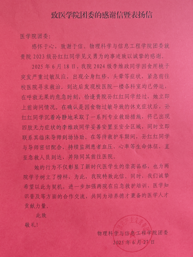 在这一天,物理科学与信息工程学院2024级李维政同学因食用桃子突发严重过敏反应,全身迅速蔓延红疹、头晕目眩,在一楼科室停运的校医院空荡走廊里呼救。千钧一发之际,久久视频