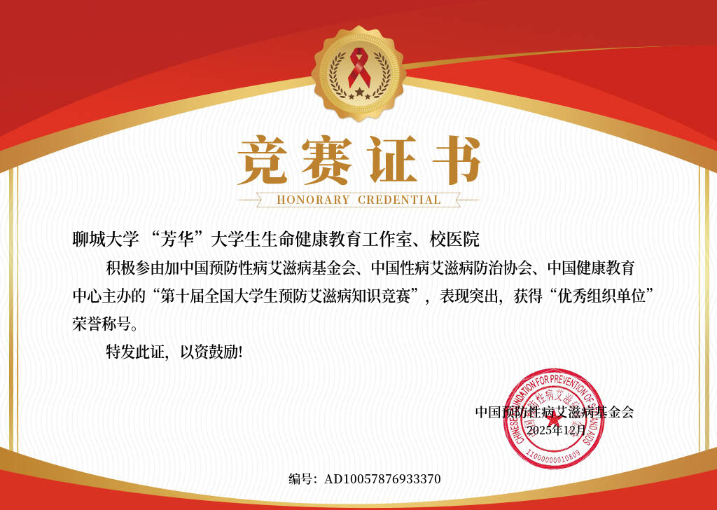 近日,“第十届全国大学生预防艾滋病知识竞赛”圆满结束,竞赛由中国预防性病艾滋病基金会、中国性病艾滋病防治协会、中国健康教育中心主办,校医院、“芳华”大学生生命健康教育工作室作为承办单位获评“优秀组织单位”,5人获“优秀指导老师”,5人获“优秀组织者”,6人获“社会实践证书”,10人获“优秀志愿者”荣誉称号。